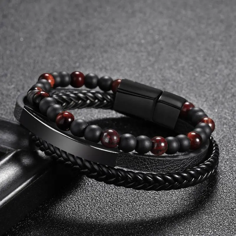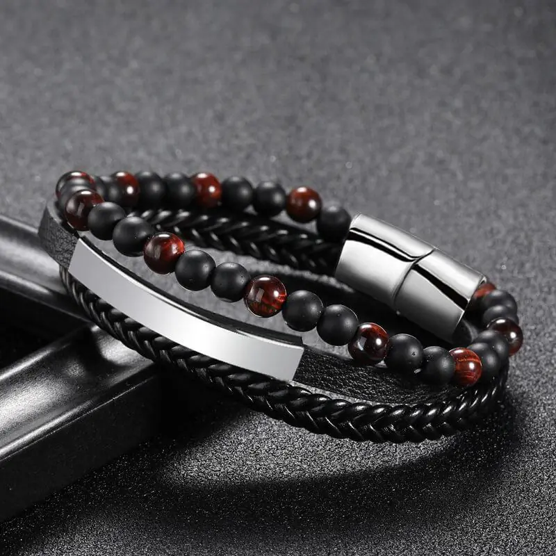 This bracelet combines leather, stone, and steel. This bracelet is like 3 bracelets in one. Wear it with anything from casual to semi-formal dress and instantly upgrade your look. Also available with all black beads.