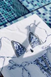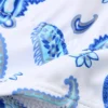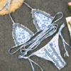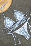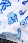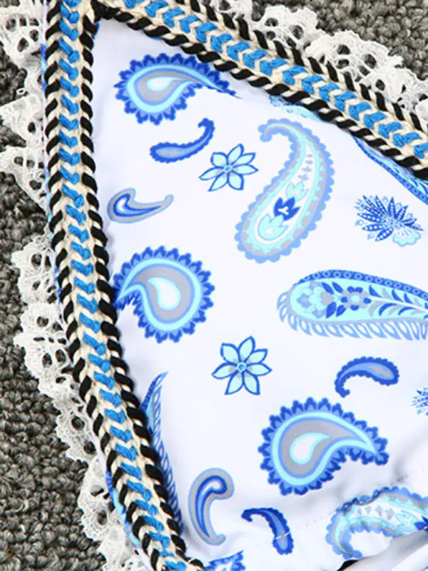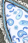 This blue paisley strappy boho bikini on white fabric is sexy and highlights your curves. White lace edging and colorful woven embroidery thread add to the bikini’s sense of style. Round metal bling at the center of the bust adds to the charm of this beautiful bikini. The full coverage bikini bottoms, which tie on the sides, rest high on the waist and help create the illusion of longer legs.