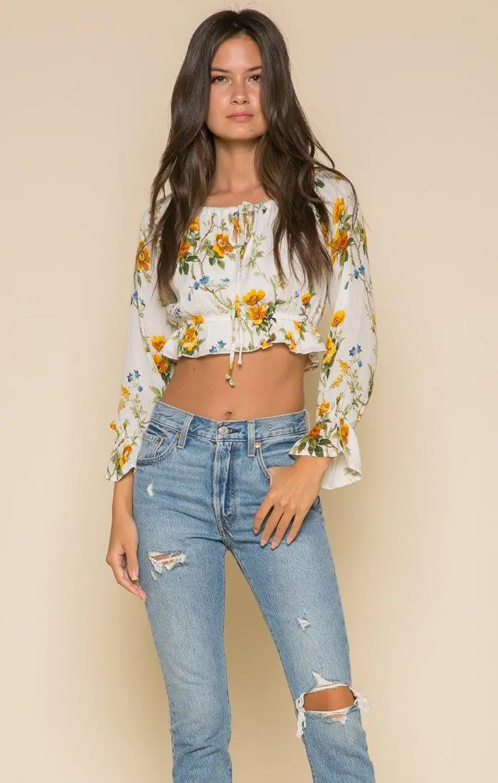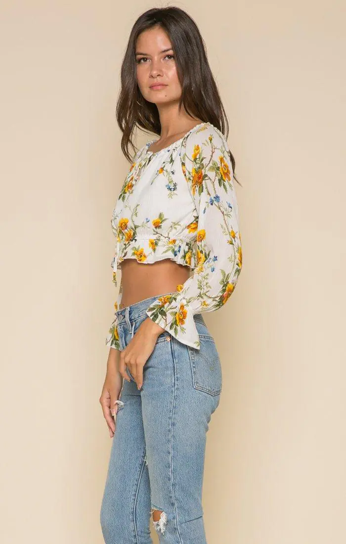 Long-sleeved crop top with all over buttercup print. You can wear this top off-shoulder or scoop neck. 100% Viscose Shell, 100% Cotton lining.
