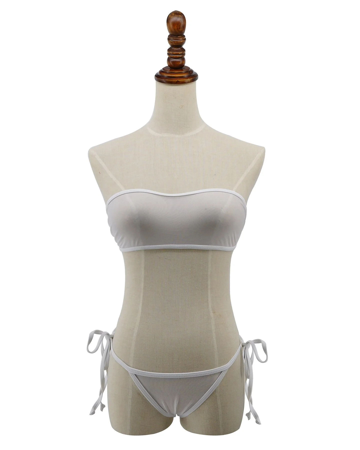 The Bandeau top is adjustable and ties in the back. The bottoms feature a thong backside, mid-coverage front, and adjustable Brazilian tie sides. The material is a high quality stretch mesh Nylon/Spandex material composed of 82% Polyamide and 18% Elathane. Material is very soft and stretchy.