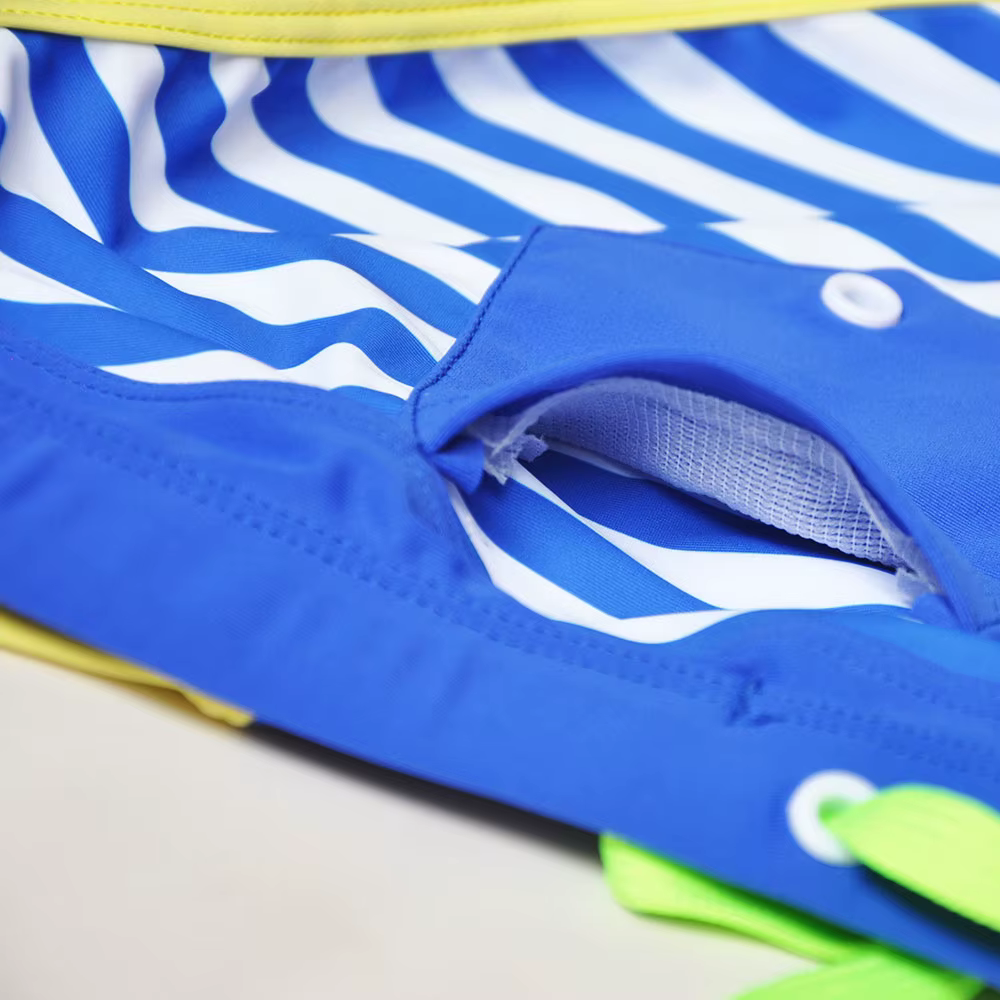 Colorful swim briefs with horizontal stripes. Comes in navy blue and white, red and white, or blue and white. Sides of swimsuit have blocks of solid color, waist is adjustable with drawstring tie. Back of swimsuit has pocket. Material is stretchy, and made from 80% Polyester and 20% Spandex. Available with or without removable front enhancement insert. Sizes run small, if you’re on the cusp of a size measurement, size up.