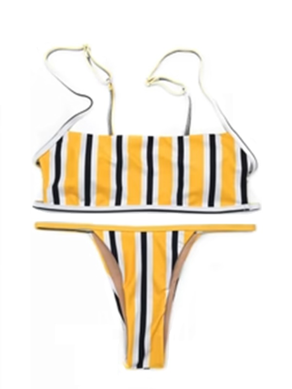 This bikini is available in gold, with white and black stripes or solid coloring. What really makes it standout sexy is its spaghetti straps, which minimize skin coverage and maximize looks. The Bandeau top is a refreshing change from the oh-so common triangle top, and has a sporty sexy look.