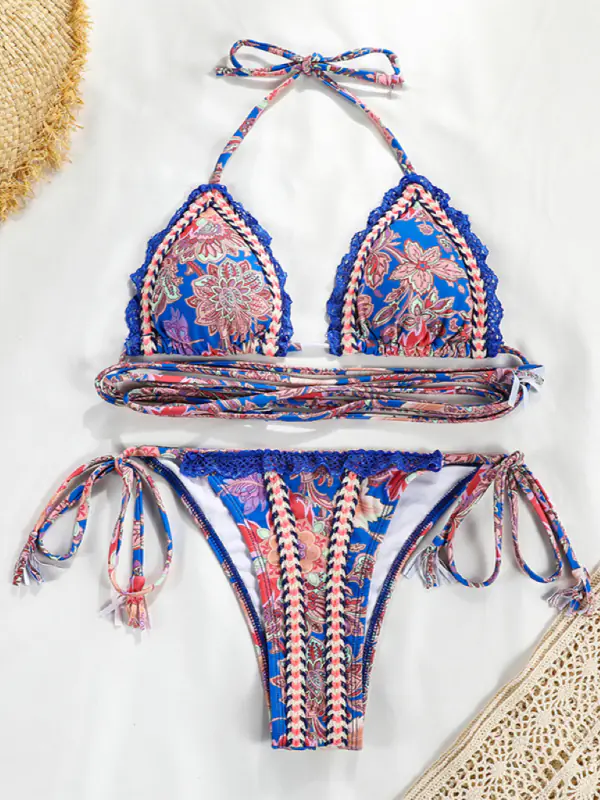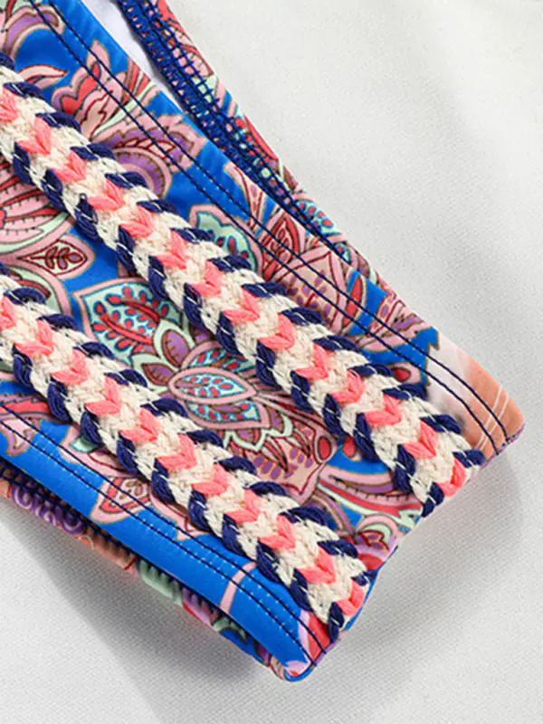 There is something about paisley bikinis! This one is a pink strappy boho bikini on blue fabric that is sexy and highlights your curves. Blue ribbon edging and colorful woven embroidery thread add to the bikini’s sense of style. The full coverage bikini bottoms, which tie on the sides, rest high on the waist and help create the illusion of longer legs. The fabric is soft to the touch and quick-drying.