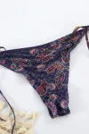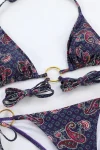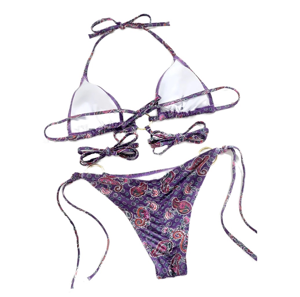 This purple paisley strappy boho bikini is sexy and highlights your curves. Large gold rings on the top and bottom straps add to the charm of this beautiful bikini. The bottoms, which tie at the sides, rest high on the waist and help create the illusion of longer legs.