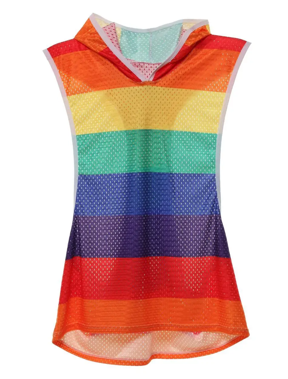 This muscle tank hoodie is all about pride! It has the colors of the pride flag printed from the top of the hood to the bottom of the tank. Thin, ventilated fabric keeps the wearer cool when it’s hot outside (see photo below). Deep-cut arm openings curve inward and run from the shoulder to the waist. Show it all off with this colorful pride hoodie! Material: Polyester 88% + Polyurethane 12%. Matching shorts sold separately.
