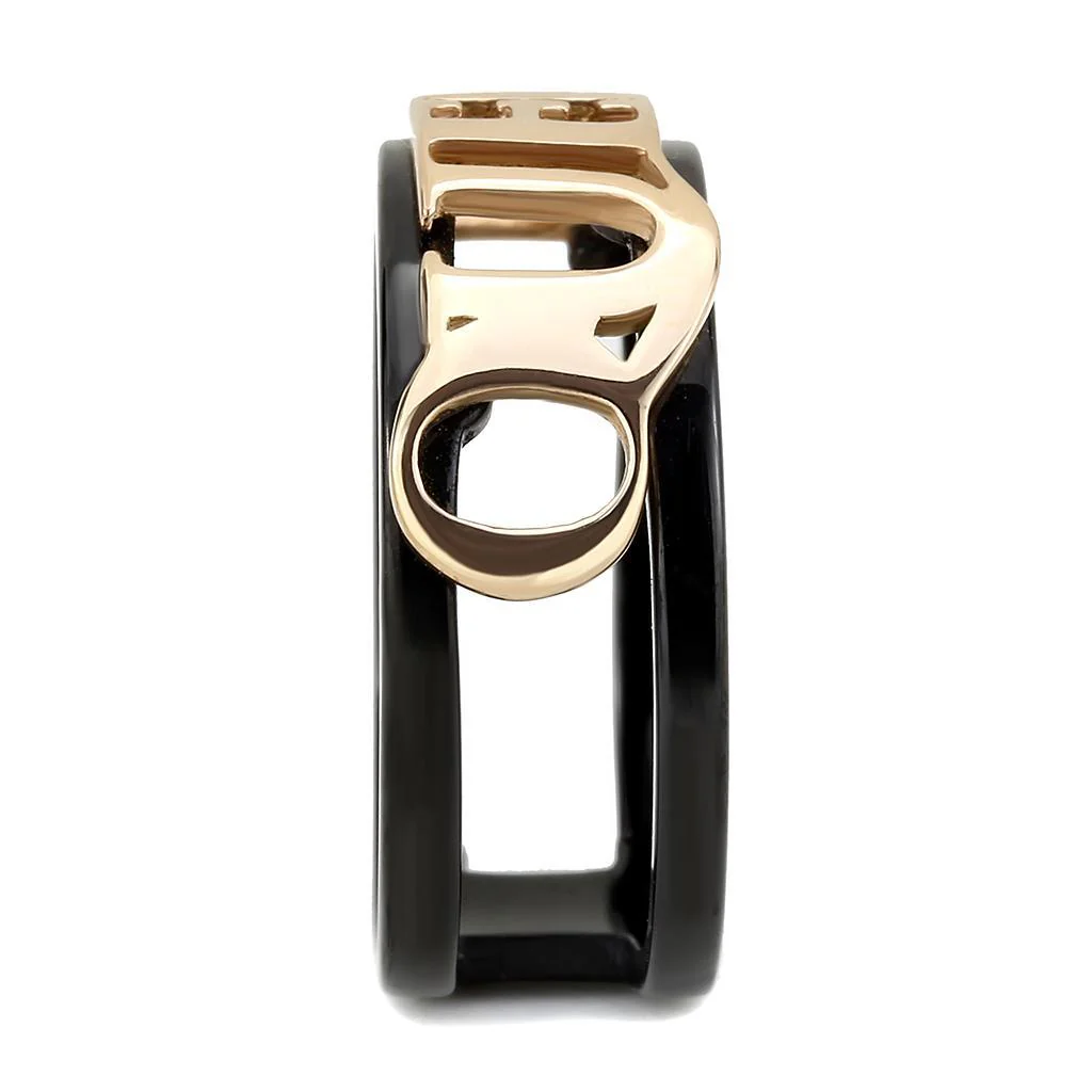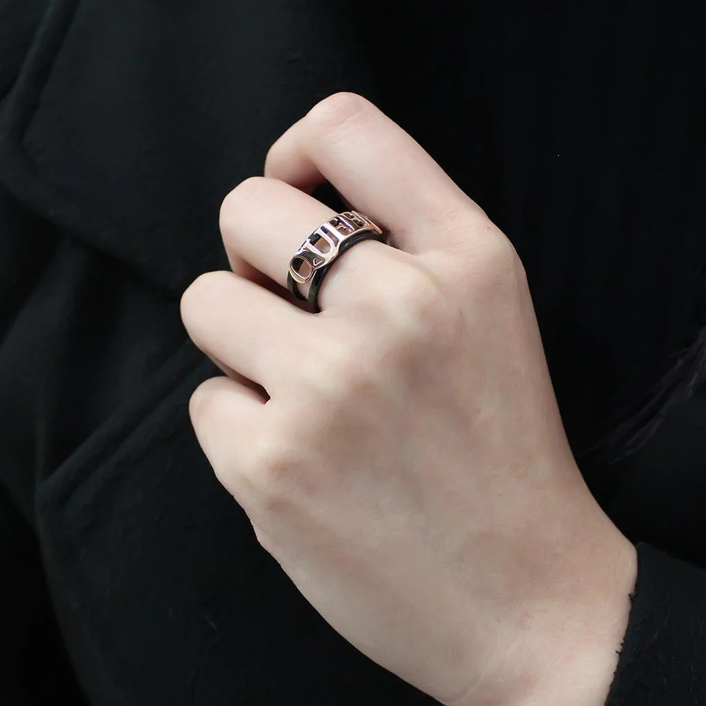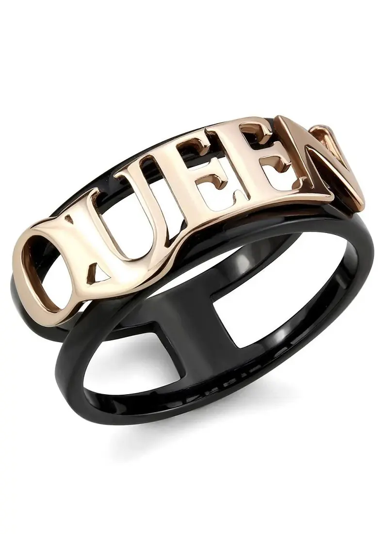 A bold ring with the word “QUEEN” done in Ion Plated Rose Gold. The rest of the ring has a black Ion Plating finish, which helps the Gold colored band stand out.