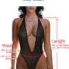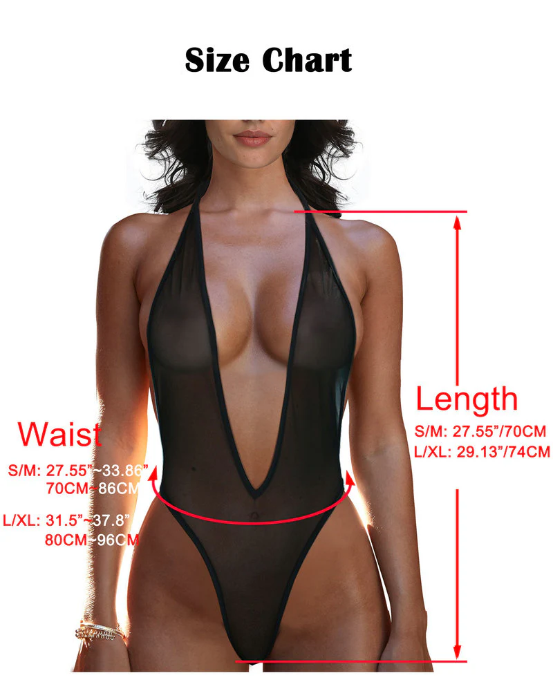 Be frisky in this sexy low v-cut mesh see through bodysuit! With its plunging v front, halter neck tie and revealing back, this one-piece is perfect for showing off. The super high cut sides help elongate your thighs and show off your shapely legs. The thong bottom shows off your back side. The swimsuit is made from high quality Nylon/Spandex material that is soft and stretchy.