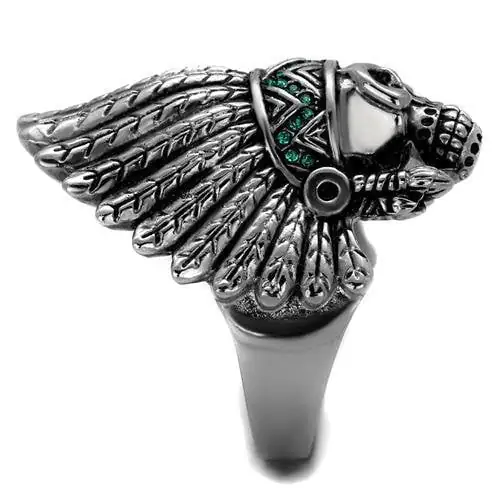 Highly polished stainless steel ring featuring a skull wearing a feather headdress. The headband of the headdress is adorned with emerald colored crystals.